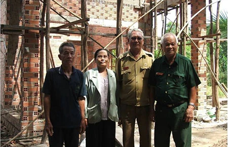 Từ trái qua:CCB Võ Văn Hùng, bà Phạm Thị Hồng, ông Dư Phước Hiệp, anh hùng LLVT Lê Chiến Thắng trước căn nhà đang xây tặng ông Hùng. (Ảnh chụp tháng 3-2013) Ảnh: HM