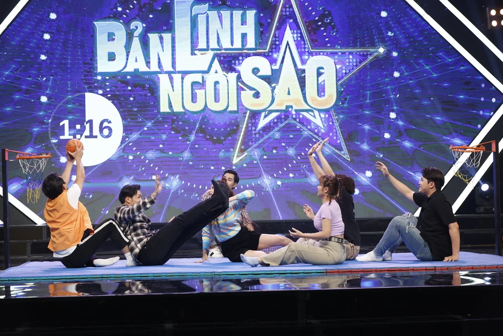 Dàn khách mời phải “lăn lê bò lếch” với phần chơi Bóng rổ. Ảnh: SEN VÀNG