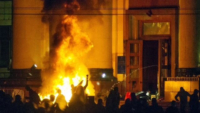 Những người biểu tình đốt lửa bên ngoài một tòa nhà ở Ukraine. Ảnh: RTE