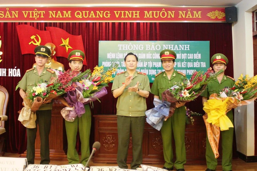 Thiếu tướng Trịnh Xuyên Giám đốc Công an tỉnh Thanh Hóa thưởng nóng cho các trinh sát khám phá nhanh vụ án. Ảnh: ĐẶNG TRUNG