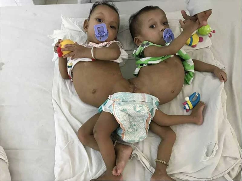 Tình trạng hai bé dính nhau trước khi phẫu thuật. Ảnh: BV