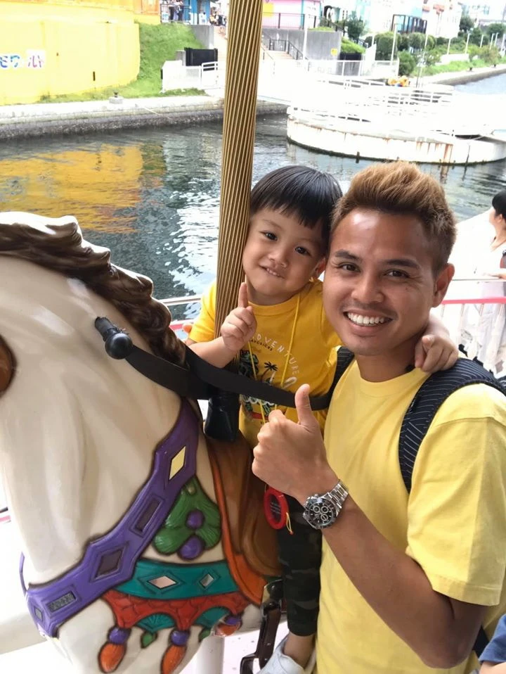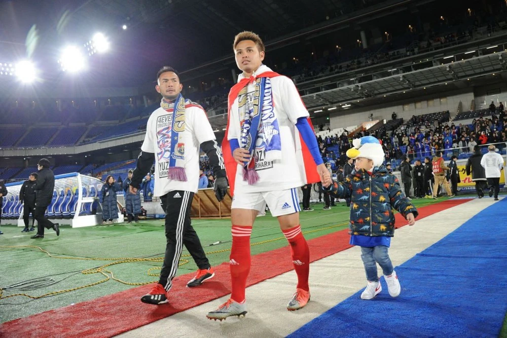 Hậu vệ Thirathorn Boonmatan ăn mừng chức vô địch J-League với con trai tại sân vận động Nissan...