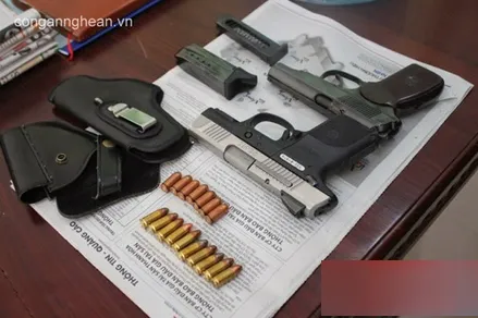 Súng đạn thu giữ trong người Tuấn.
