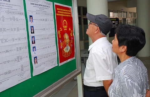 Cử tri xem danh sách những người ứng cử đại biểu Quốc hội khóa XIII và ứng cử đại biểu HĐND TP.HCM khóa VIII tại một đơn vị bầu cử. Ảnh: HTD