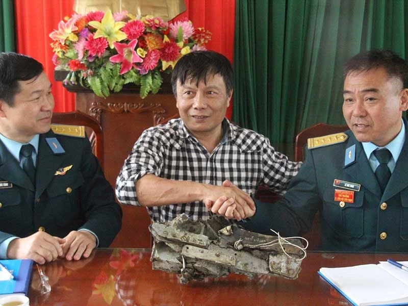 TS Nguyễn Lê Anh (giữa), người trực tiếp tìm kiếm thực địa Tam Đảo làm việc với đại diện Quân chủng Phòng không không quân để bàn giao mảnh vỡ máy bay tìm được. Ảnh: TUYẾN PHAN