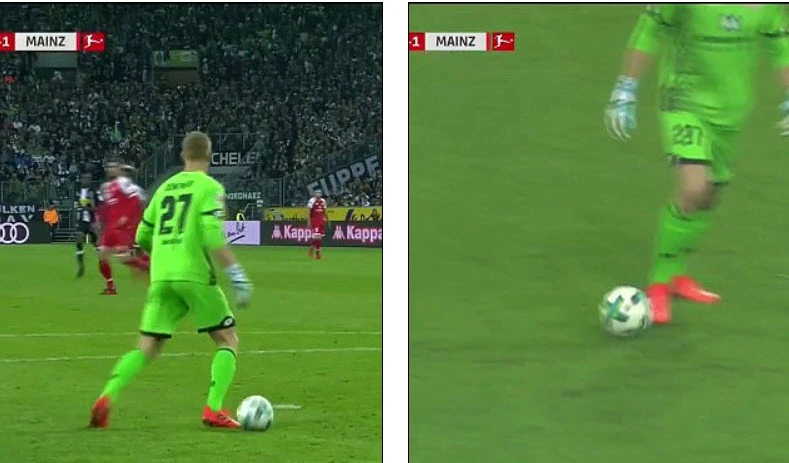 Nhìn xuống dưới chân… không thấy bóng đâu, Robin Zentner nhận ra sai lầm và kịp quay lại khống chế quả bóng đúng lúc Lars Stindl của Gladbach cũng lao tới tranh chấp. Rất may là Robin Zentner đã đi trước một bước và cùng với đồng đội phá bóng ra ngoài biên. Tình huống này khiến cả sân, kể cả đồng đội của thủ thành tội nghiệp Robin Zentner được một trận cười nghiêng ngả.