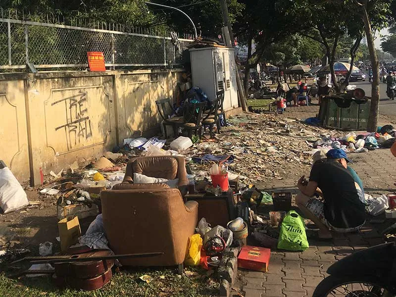 Những ngày cuối năm này, các con đường có bãi đất trống hoặc chân cầu vượt như cầu Thị Nghè (quận 1), đường Trường Sa (quận Phú Nhuận và quận Bình Thạnh), đường Võ Văn Kiệt (quận 1), đường Nguyễn Văn Linh (quận 7)… trở thành nơi chứa các loại rác khủng như nệm, ghế, bồn cầu hư, ghế sofa, manơcanh…