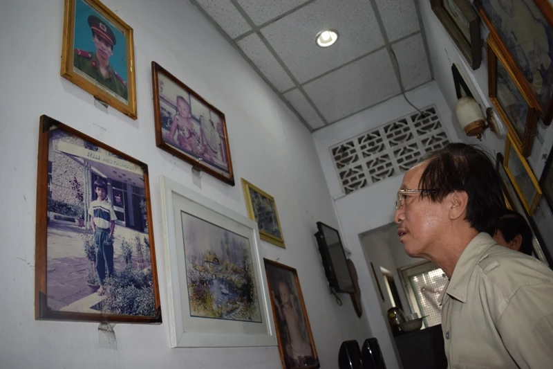 Ông Phạm Kiêm Chính lặng người bên những tấm ảnh của con trai ngày còn bé. Ảnh: NGUYỄN TRÀ