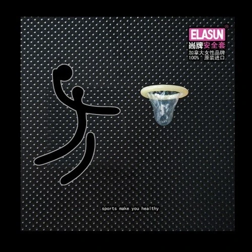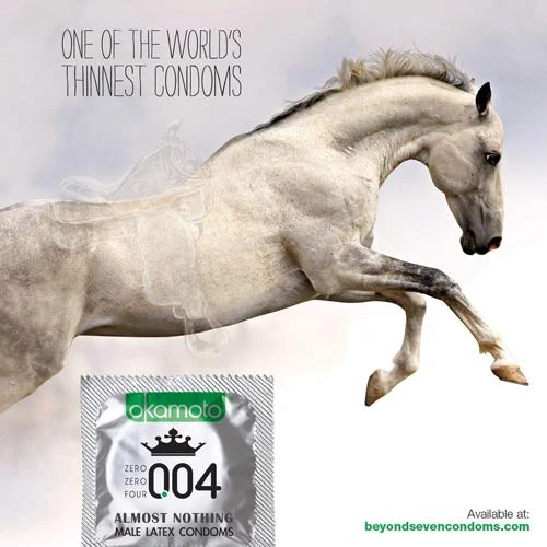 Tại Mỹ, loại bao cao su siêu mỏng của Okamoto được minh họa bởi chú ngựa mạnh mẽ và chiếc yên trong suốt.