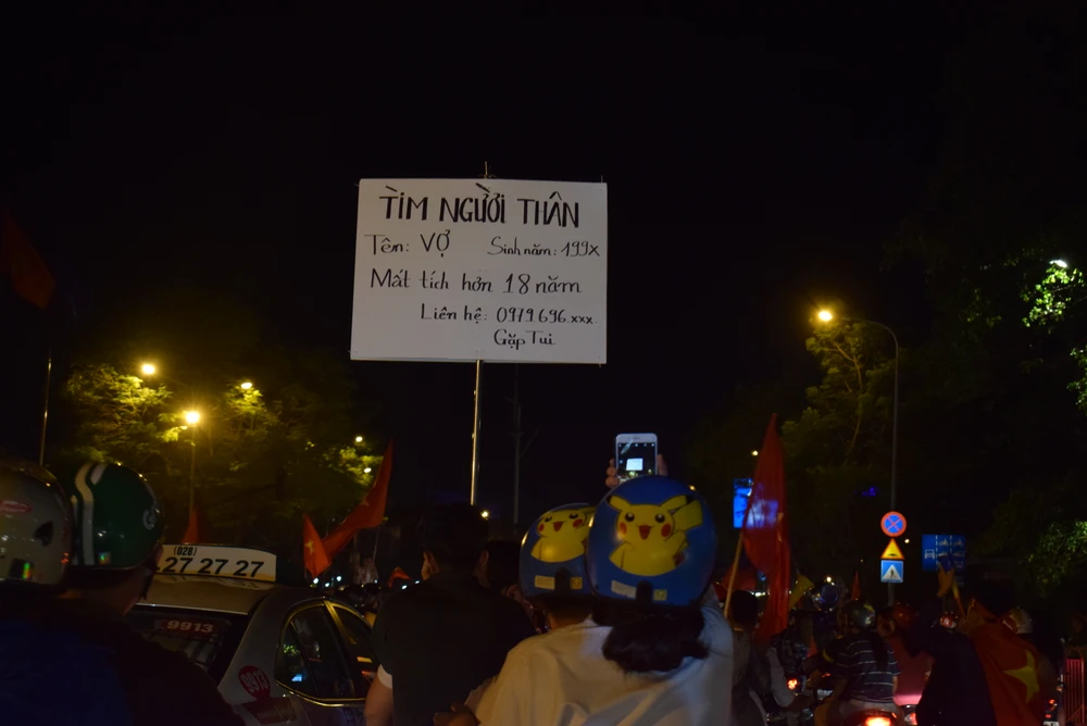 Tấm biển to đùng ghi rõ: "Tìm người thân, tên: Vợ, mất tích hơn 18 năm" được giơ cao để... người vợ thất lạc đâu đó giữa biển người có thể nhìn rõ. Nhưng tiếc là anh chàng lại không để lại số điện thoại liên lạc đầy đủ, làm sao người vợ biết đường tìm về.