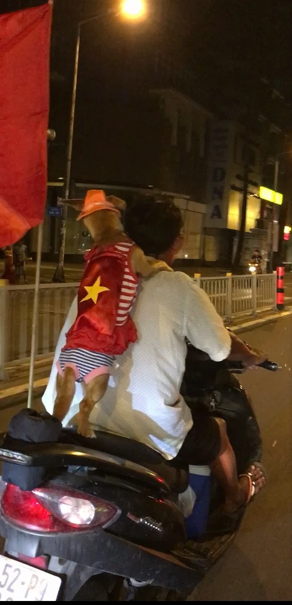 Đêm "bão" 11 rạng sáng 12-12 chứng kiến không ít thú cưng đi "bão" cùng chủ. Trong đó, chú chó nhỏ mặc áo quần, đội mũ kute, khi ngồi trước biết ghì vào đầu xe, đứng sau biết ôm lưng chủ để khỏi té ngã khiến nhiều người thích thú.