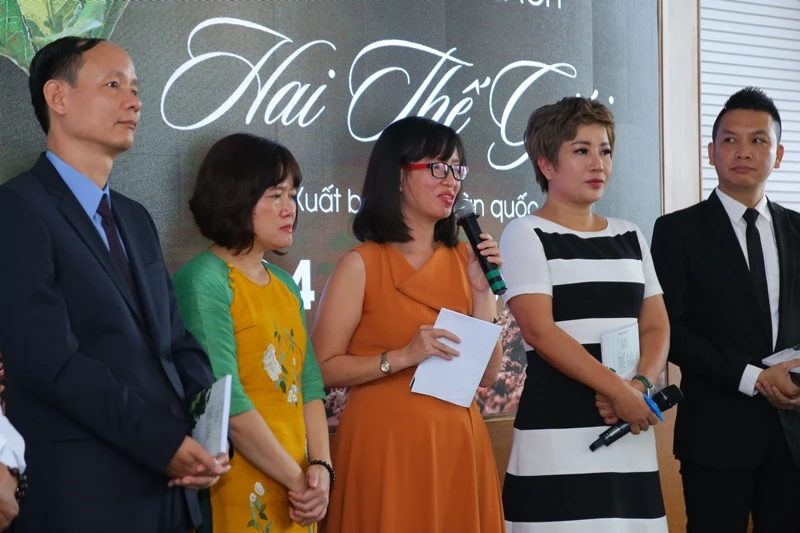 Gia đình tác giả Nguyễn Xuân Minh tại buổi ra mắt sách Hai thế giới. Ảnh: AH