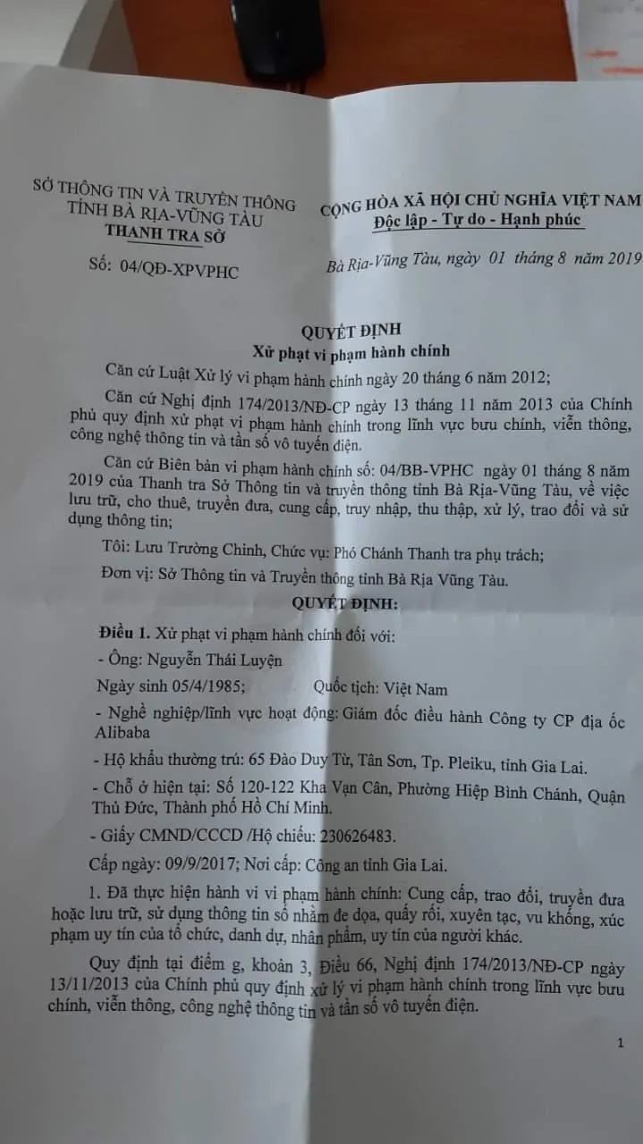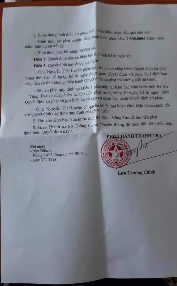 Ngày 1-8, căn cứ quy định tại điểm g khoản 3 Điều 66 Nghị định 174/2013 của Chính phủ, Sở TT&TT xử phạt ông Luyện 7,5 triệu đồng và không áp dụng các biện pháp khắc phục hậu quả (ông Luyện nhận QĐXP cùng ngày).