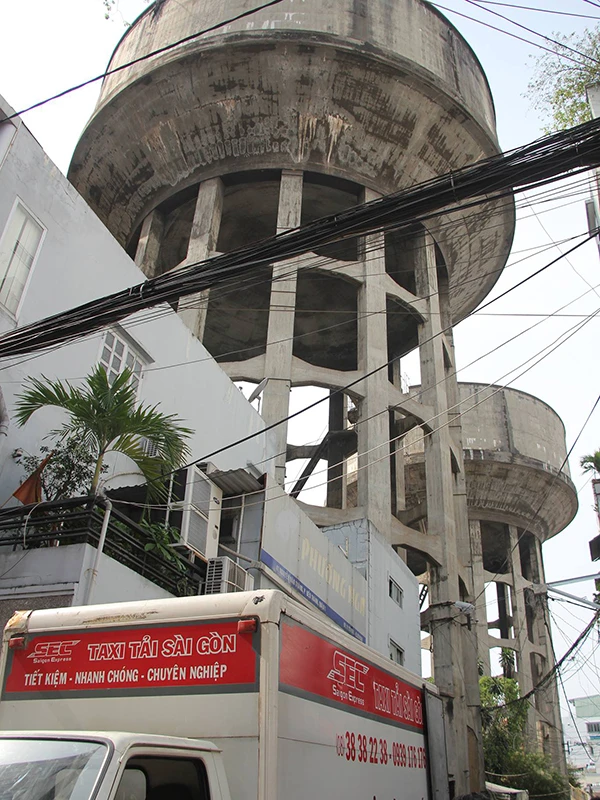 Theo quan sát, hai thủy đài cao khoảng 30 mét đã cũ kỹ, nhiều vị trí tường bê tông bong trốc, trơ khung thép rỉ sét bên trong. Ở dưới là những ngôi nhà lụp xụp, xây dựng tạm bợ làm nơi sinh sống, buôn bán của hàng chục người.