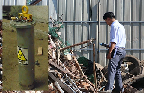 Dò tìm nguồn phóng xạ tại các vựa ve chai quanh nhà máy thép bị mất cục phóng xạ. Nguồn phóng xạ bị thất lạc (ảnh nhỏ). Ảnh: TK