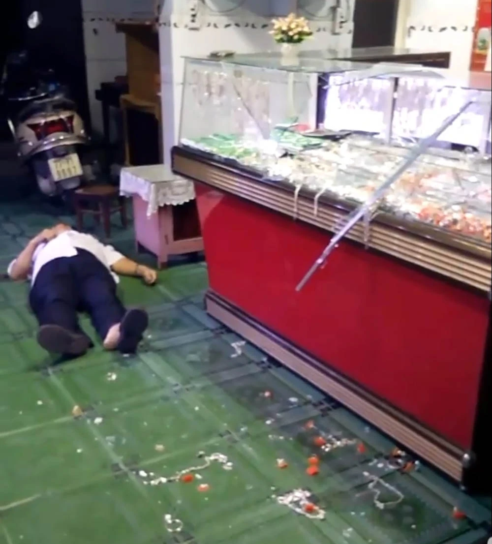 Chủ tiệm vàng bị cướp tấn công, nằm gục trên nền nhà. Ảnh cắt từ clip