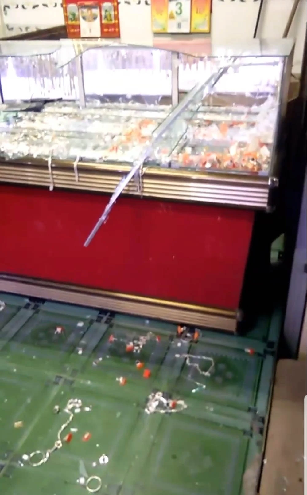 Tủ đựng vàng bày bán bị đập vỡ, nhiều nữ trang rơi trên nền nhà. Ảnh cắt từ clip