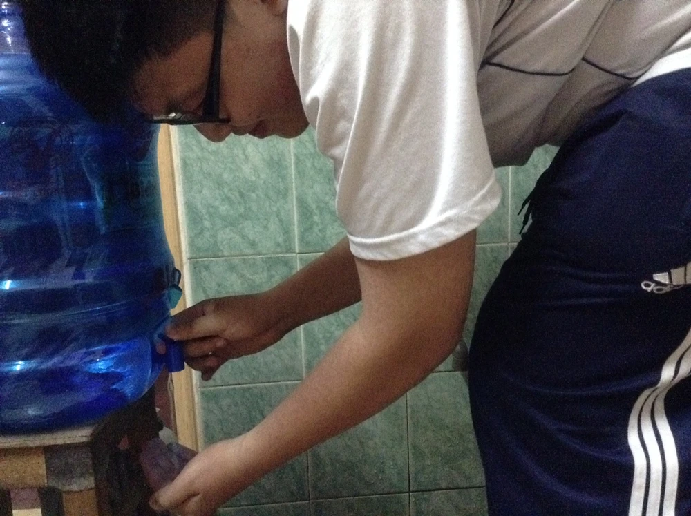 Do bị cúp nước đột xuất nên nhiều hộ dân phải dùng nước đóng bình rửa mặt. Ảnh: TRẦN NGỌC