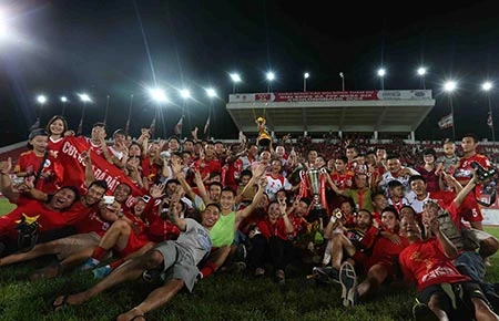 Hải Phòng nhận cúp vô địch sau 19 năm trong khi B. Bình Dương thì dở đều và có lúc cố tình căng thẳng không đáng có. Ảnh: QUANG THẮNG