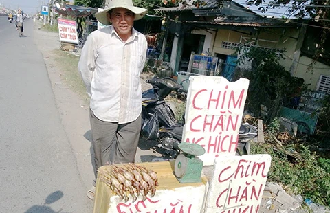 Ngày 21-1, chúng tôi phát hiện tại khu vực nói trên có trên 10 người bày ra nhiều con chim được làm thịt và ghi dòng chữ “chim chằn nghịch” (chàng nghịch, một loài chim rừng). Thực chất đây là các con chim cút nuôi, được người bán nhổ lông, tẩm ướp và thui cho vàng rồi gắn mác “chim chằn nghịch” để bán với giá cao gấp 3-4 lần.