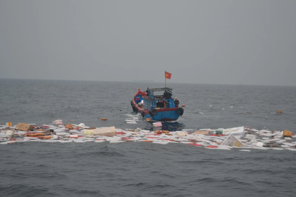 Hàng hóa trên tàu chìm trôi trên biển.