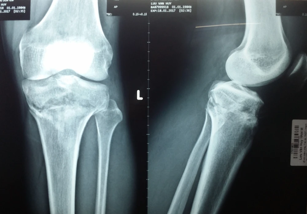 Kết quả chụp X quang do cơ sở y tế địa phương thuộc tỉnh Long An thực hiện cho thấy gối-gãy mâm chày không di lệch. Ảnh: VIẾT THÔNG