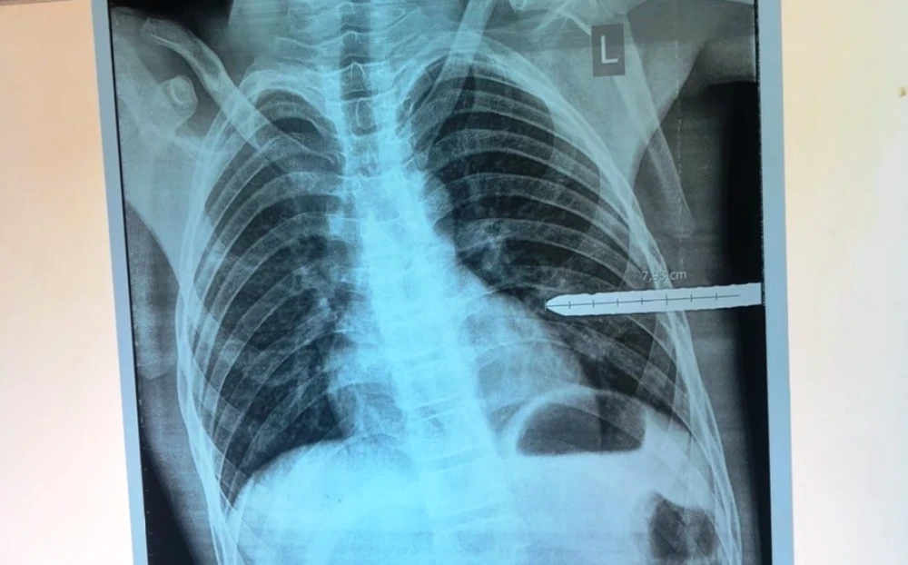 Theo người thân bệnh nhi, khoảng 16 giờ chiều cùng ngày, trong lúc chơi đùa với bạn bệnh nhi bị thanh sắt đâm trúng ngực trái và được đưa đến BV Đa khoa huyện Nghi Xuân cấp cứu.