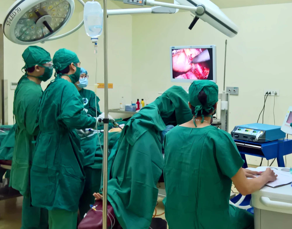 Các bác sĩ đang mổ cấp cứu cho bệnh nhân V. Ảnh: LÊ PHỤNG