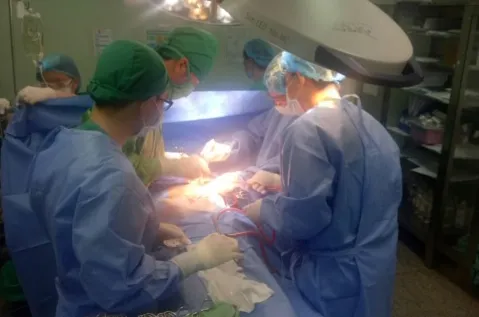Bỏ qua tất cả thủ tục hành chính, anh T. nhanh chóng được chuyển lên phòng mổ. Sau khi mở đường trước bên ngực trái, các BS xẻ màng tim hút ra khoảng 200 ml máu loãng và 200 gr máu cục. Tiếp theo, các BS khâu lại tâm thất phải, rửa sạch và dẫn lưu khoang màng tim.
