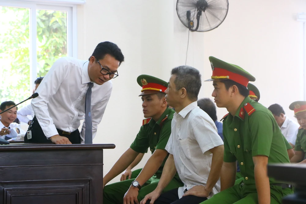 Luật sư trao đổi với bị cáo Khanh trong thời gian HĐXX hội ý. Ảnh: LÊ ÁNH