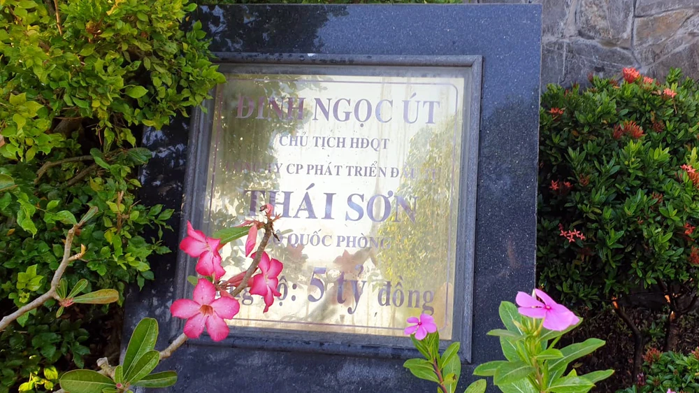 Tấm biển với dòng chữ “Đinh Ngọc Út, Chủ tịch HĐQT Công ty CP Phát triển đầu tư Thái Sơn (Bộ Quốc phòng) ủng hộ 5 tỷ đồng” tại Huỳnh Phủ Đường.