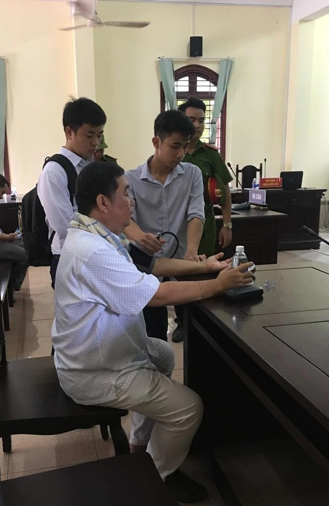 Sau khi tòa vào nghị án, bác sĩ phải đo huyết áp cho bị cáo Minh để kiểm tra sức khỏe. Ảnh: NN