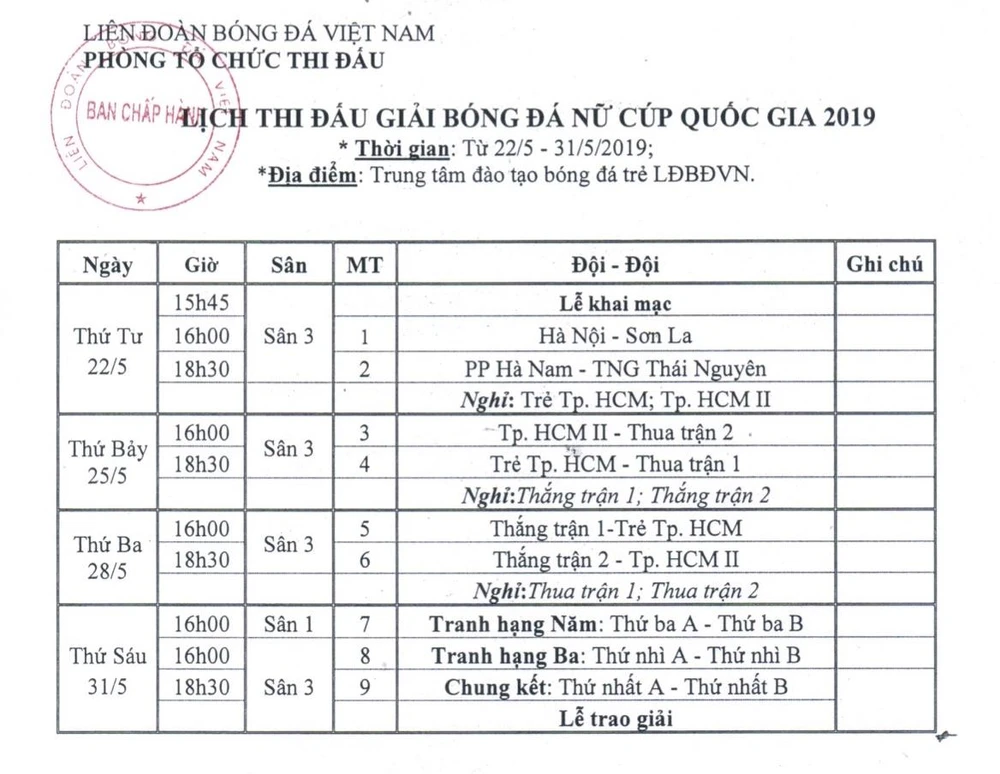 Lịch thi đấu Cúp Quốc gia nữ 2019.