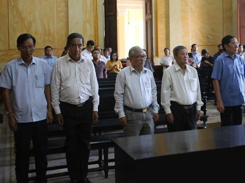Các bị cáo tại tòa ( bị cáo Lê Quang Thung bìa phải). Ảnh: HY
