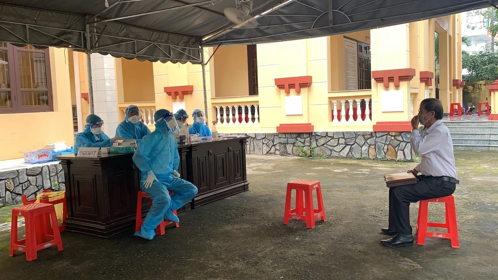 Khu vực test nhanh COVID-19 cho những người tham dự phiên tòa xử cựu chủ tịch TP Trà Vinh. Ảnh: HD
