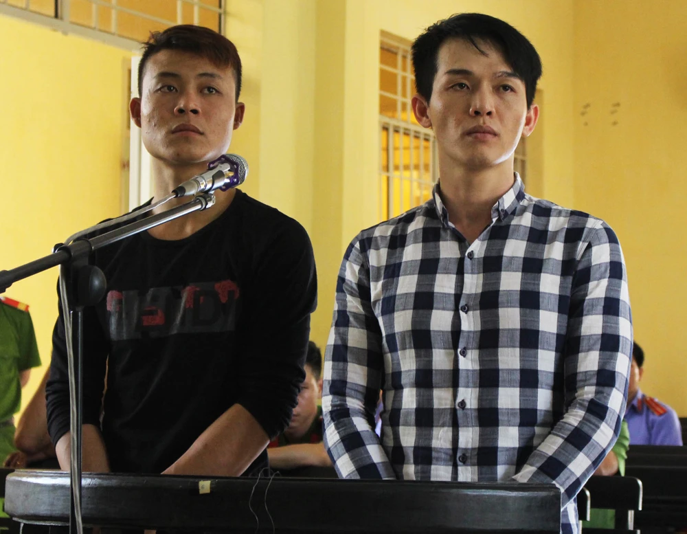 Bị cáo cựu công an viên Lê Minh Phát (bên phải) được giảm án và bị cáo Lê Tấn Khỏe được tuyên mức án tương đương thời gian bị bắt tạm giam. Ảnh: TẤN LỘC