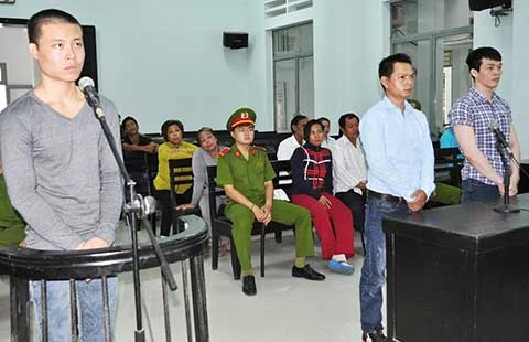 Bị cáo Lê Tấn Khỏe (bìa trái)và hai cựu công an viên Lê Ngọc Tâm, Lê Minh Phát tại phiên tòa phúc thẩm ngày 21-7. Ảnh: TẤN LỘC