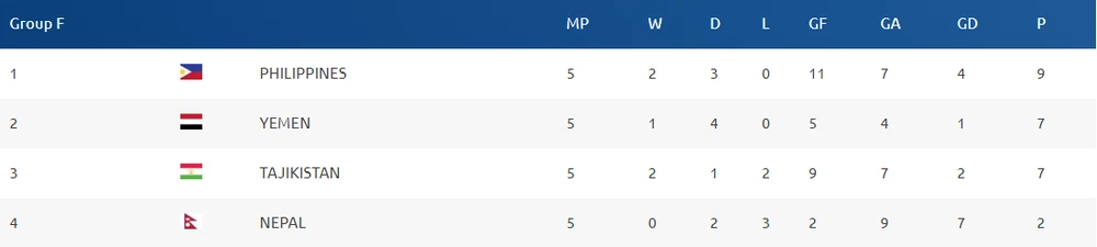 Cục diện bảng F trước lượt trận cuối cùng chiều và tối 27-3 như sau: 1- Philippines đầu bảng (9 điểm), 2- Yemen (7 điểm), 3- Tajaikistan (7 điểm), 4- Nepal (2 điểm, đã bị loại).