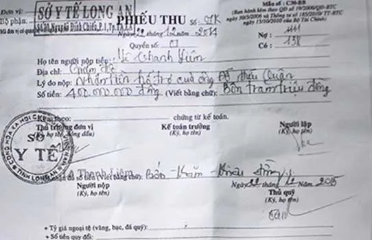 Ông Lê Thanh Liêm khi còn là giám đốc Sở Y tế tỉnh Long An và phiếu thu thể hiện ông Liêm nộp 400 triệu đồng do ông Quân tặng.