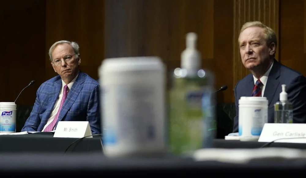 Chủ tịch Ủy ban an ninh quốc gia về trí tuệ nhân tạo Eric Schmidt (bên trái) và chủ tịch Tập đoàn Microsoft Brad Smith tại phiên điều trần hôm 23-2. Ảnh: AP