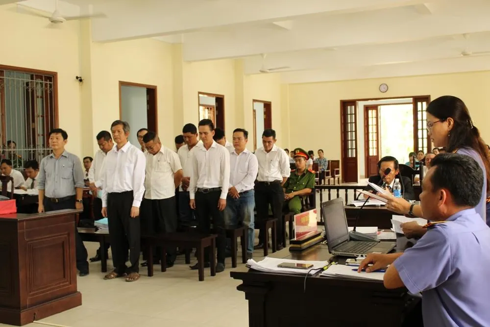 Các bị cáo đứng nghe đại diện VKS trình bày quan điểm luận tội chiều 13-6. Ảnh: NN