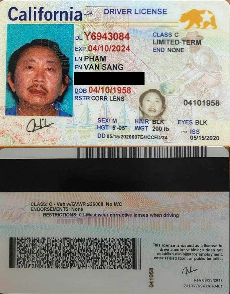 Bằng lái xe được cho là của ông Sáng do cơ quan chức năng Mỹ cấp. Ảnh: Bạn đọc cung cấp