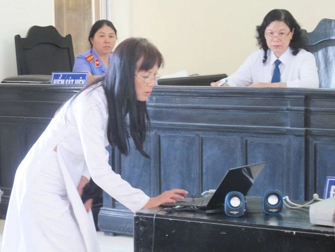 Tại phiên tòa, nguyên đơn- cựu giáo viên Nguyễn Thị Minh Đệ mở các file ghi âm để chứng minh bị trù dập.Ảnh: TẤN LỘC