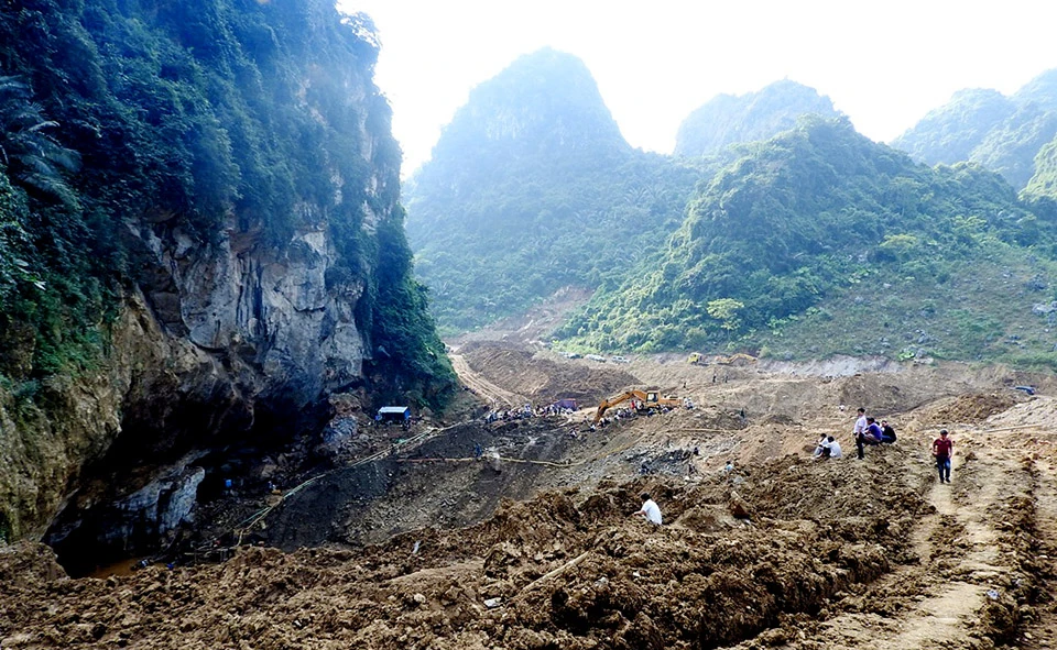 Một khối lượng bùn đất đổ ập xuống lấp cửa hang Cột Cờ (Thanh Nông, Lạc Thủy) nơi hai phu vàng mắc kẹt.