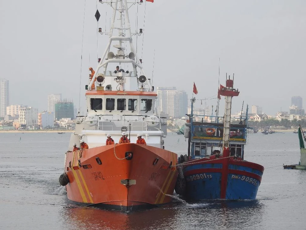 Tàu SAR 412 đã đưa tàu Dna 90901 cùng các thuyền viên vào bờ an toàn. Ảnh. Danang MRCC
