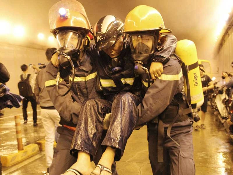 Trinh sát cảnh sát PCCC đeo mặt nạ chống độc cứu người trong một buổi diễn tập phòng, chống cháy nổ tại TP.HCM. Ảnh: HOÀNG GIANG