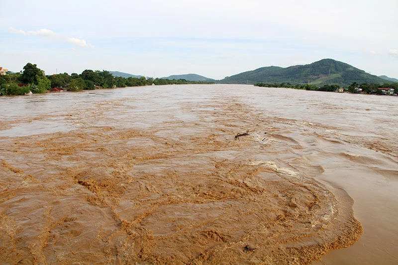 Lũ trên sông Mã tại Cẩm Thủy vượt ngưỡng báo động 3 gần 2 m và cao hơn đỉnh lũ lịch sử năm 2007 gần 1 m. Ảnh: Đ.TRUNG