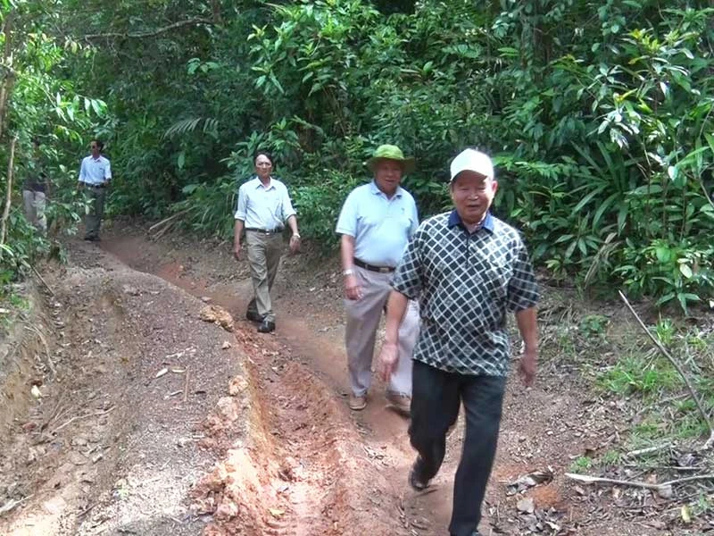Ông Nguyễn Văn Chín, nguyên Chủ nhiệm Ủy ban Kiểm tra Tỉnh ủy Phú Yên (đi đầu) và ông Lê Văn Hữu, nguyên Chủ tịch UBND tỉnh (thứ hai) đi thị sát các khu rừng bị xóa sổ để nuôi bò. Ảnh: P.NAM