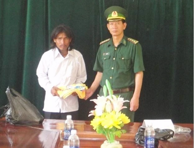 Lãnh đạo Đồn biên phòng Roòn trao đồ dùng cá nhân cho anh Siêng Xay Nha Vông (quốc tịch Lào). Ảnh: Báo Biên Phòng