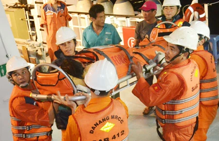 Tối 12-2, trung tâm nhận được điện cầu cứu từ tàu QNg-92679 TS: “Một thuyền viên bị cá cắn mất nhiều máu, cần được hỗ trợ y tế khẩn cấp”. “Ngay khi nhận điện, chúng tôi đã kết nối với Trung tâm Y tế 115 để tư vấn y tế. Các bác sĩ ở đây hướng dẫn cho thuyền viên trên tàu băng bó, cầm máu cho thuyền viên Trần Văn Đạt” - anh Hồ Xuân Phong (nhân viên điện đài) cho biết. Tuy nhiên, qua gần bảy giờ sơ cứu, nạn nhân vẫn không cầm được máu, tình trạng sức khỏe nguy kịch, hơi thở yếu. Danang MRCC quyết định điều động tàu SAR 412 với 19 thủy thủ cùng BS Ngô Diên Anh Tuấn (Trung tâm Cấp cứu 115) “xuất kích”, ra khơi cứu nạn. 22 giờ đêm 12-2, giữa sóng to gió lớn, thuyền trưởng Nguyễn Xuân Sơn chỉ huy tàu nhổ neo hướng về phía Hoàng Sa. Đến trưa 13-2 thì tiếp cận được tàu cá QNg-92679 TS. Do thời tiết trên biển xấu nên việc chuyển nạn nhân sang tàu cứu nạn rất khó khăn. Các thủy thủ tàu SAR phải di chuyển qua tàu cá để cố định nạn nhân trên cáng, sau đó bác sĩ mới tiến hành cấp cứu.